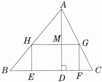 如图,$\triangle ABC$是一张锐角三角形的硬纸片,$AD是边BC$上的高,$BC = 40\mathrm{cm}$,$AD = 30\mathrm{cm}$,从这张硬纸片上剪下一个长($HG$)是宽($HE$)$2$倍的矩形 $EFGH$,使它的一边 $EF在BC$上,顶点 $G$,$H$分别在 $AC$,$AB$上,$AD与HG$的交点为 $M$。