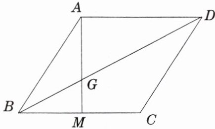 如图,四边形 $ABCD$ 为菱形,$M$ 为 $BC$ 上一点,连接 $AM$ 交对角线 $BD$ 于点 $G$,并且 $\angle ABM = 2\angle BAM$。