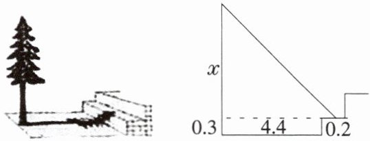 解:设树在第一级台阶上面的部分高x米,则$\frac{1}{0.4}=\frac{x}{4.4+0.2}$,解得x=11.5,