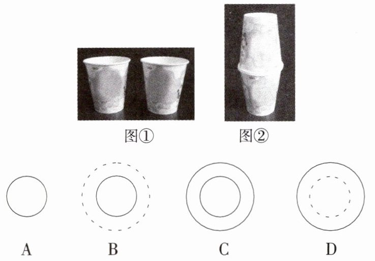 4. 将两个大小完全相同的杯子(如图①)叠放在一起(如图②),则图乙中的实物的俯视图是(