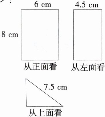 1. 如图是某几何体从正面、左面、上面看到的形状图。若从正面看到的长方形的宽为$6 cm$,长为$8 cm$,从左面看到的宽为$4.5 cm$,从上面看到的直角三角形的斜边为$7.5 cm$,这个几何体的侧面积是多少?