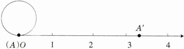 10. 如图,将直径为$1个单位长度的圆形纸片上的点A$放在数轴原点上,若将圆沿数轴正方向滚动一周,点$A恰好与点A ^ { \prime }$重合. 判断点$A ^ { \prime }$对应的数是有理数还是无理数,并写出点$A ^ { \prime }$对应的数.