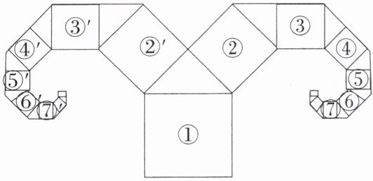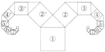 2. 如图所示是一种“羊头”形图案,其作法是从正方形①开始,以它的一边为斜边,向外作等腰直角三角形,然后再以其直角边为边,分别向外作正方形②和②'……以此类推,若正方形①的边长为$64\ cm$,求正方形⑦的边长。