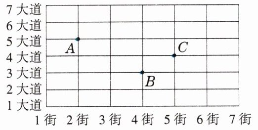 2. 如图所示,点A表示2街与5大道的十字路口,点B表示4街与3大道的十字路口,点C表示5街与4大道的十字路口,如果用 $ (4,3)\to(5,3)\to(5,4) $ 表示由B到C的一条路径,那么,你能用同样的方式写出由A经B到C的路径吗?请写出其中的五条。(不含回头和绕远的走法)