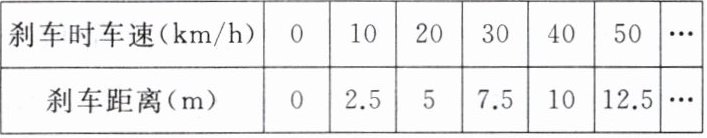 (3)由表格可知,刹车时车速每增加10km/h,刹车距离增加2.5m,所以y与x之间的关系式为y=0.25x(x≥0);