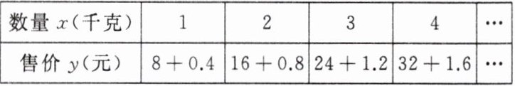 5. 某商店出售某商品时,在进价的基础上加一定的利润,其数量 $ x $ 与售价 $ y $ 的关系如下表所示。请根据表中所提供的信息,列出 $ y $ 与 $ x $ 的函数关系式并求出当数量是 2.5 千克时的售价。