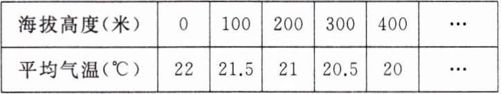 (2)400~800米的山区 解$:(1)y=22-\frac{22-21.5}{100}·x =22-\frac{0.5}{100}·x =22-0.005·x (2)$当y=18时代入18=22-0.005·x 0.005x=4 x=800 当y=20时代入20=22-0.005·x 0.005x=2 x=400