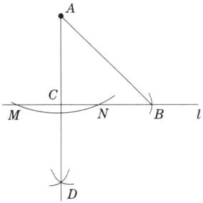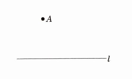 如图,已知直线 $l$ 和 $l$ 外一点 $A$,请用尺规作图法,求作一个等腰直角 $\triangle ABC$,使得顶点 $B$ 和顶点 $C$ 都在直线 $l$ 上。(作出符合题意的一个等腰直角三角形即可,保留作图痕迹,不写作法)