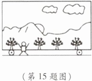 15. 看电视转播时,我们会感觉运动员在球场上来回不停地跑动,但实际上他们始终处于电视屏幕上,这是为什么呢?为了探究这个现象发生的原因,小华设计了如图所示的实验:在小桌上面安装一个滑轮,上面放着一幅带轮子的背景画,前面放一个小卡通玩偶。