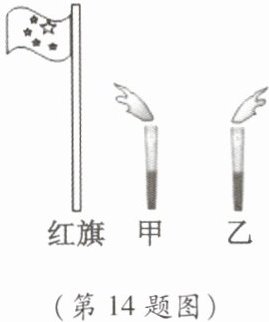 14. 在北京冬奥会火炬传递活动中,现场某记者同时拍下了固定在地面上随风飘动的旗帜和附近甲、乙两火炬的照片,如图所示。根据它们的飘动方向,四位同学作了下列判断:小明认为甲火炬一定是静止的;小华认为甲火炬一定是向右运动的;小红认为乙火炬一定是静止的;小亮认为乙火炬一定是向左运动的。你认为他们四位同学一定判断正确的是