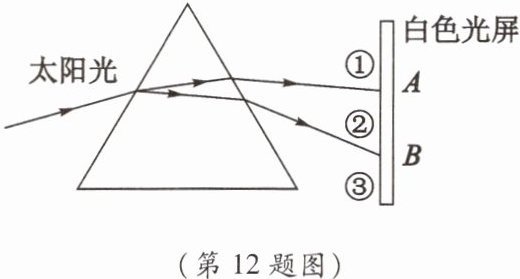 12. 如图所示,一束太阳光通过三棱镜后,在白色光屏上会形成一条彩色光带(AB区域),白色光屏A处我们看到的是