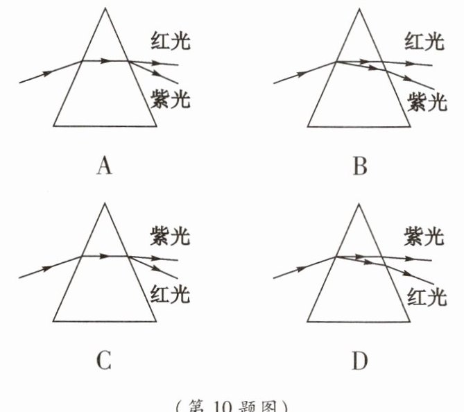 10. 光的色散说明白光是一种复色光,三棱镜对不同色光的偏折程度不同,其中对红光的偏折程度最小,对紫光的偏折程度最大。图中能正确表示白光通过三棱镜发生色散的是(