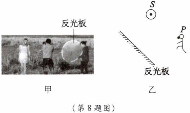 8. 反光板是摄影中常用的道具,如图甲所示,它可以将光源发出的光线反射到被拍摄人物上,增加亮度,从而使拍摄的人物更加明亮清晰。请在图乙中画出一束从太阳上 S 点发出的光,经反光板反射至人脸上的 P 点的光路图。