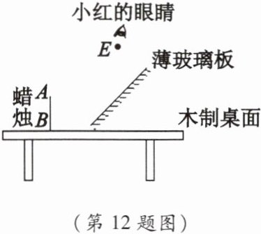 12. 小红在做“验证平面镜所成像的大小与物的大小相等”实验时把薄玻璃板按如图所示的方式倾斜放置。
