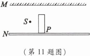 11. 如图所示为某廊道的平面图,廊道的外墙玻璃 M 在夜色中成了平面镜,小明站在不透明的宣传板 P 前面的 S 点处,通过外墙玻璃看内墙 N 上的画。请作出小明从外墙玻璃中看到内墙最远位置的光路图。