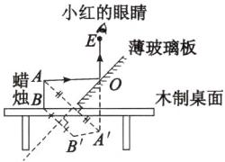 ②小红在 E 点看到 A'时,从 A 点发出的一条光线经薄玻璃板反射后刚好经过 E 点,画出这条入射光线及其反射光线。