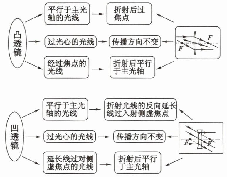 解题技巧 凸透镜和凹透镜的三条特殊光线需要同学们熟记,可以两类透镜对比着记忆。