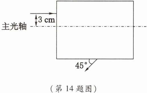 14. 如图所示,黑色箱子内有一个焦距为3cm的凸透镜和一个平面镜,请你画出箱内的光路图,并标出平面镜上入射角的度数。