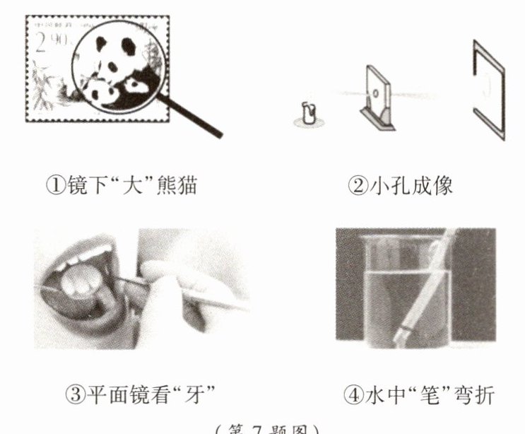 7. 如图所示的光学现象,其成像原理和成像虚实均相同的一组是(