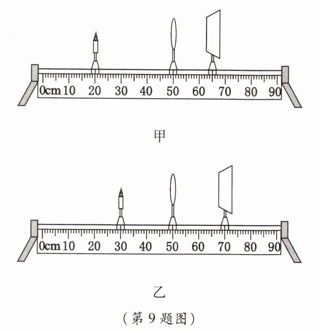 9. 小红和家人一起乘高铁去旅行,进站时要进行身份验证,她发现屏幕上的头像较小,不能完成人脸识别,后来在工作人员的指导下顺利完成了识别。她了解到屏幕上的头像是通过摄像头内的凸透镜形成的,于是带着兴趣进行了以下实验。