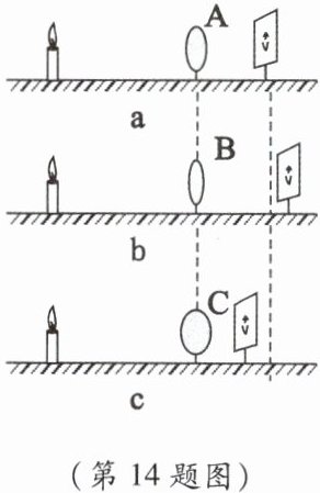 14. 小明用如图所示的一组实验来研究近视眼和远视眼的形成及矫正。