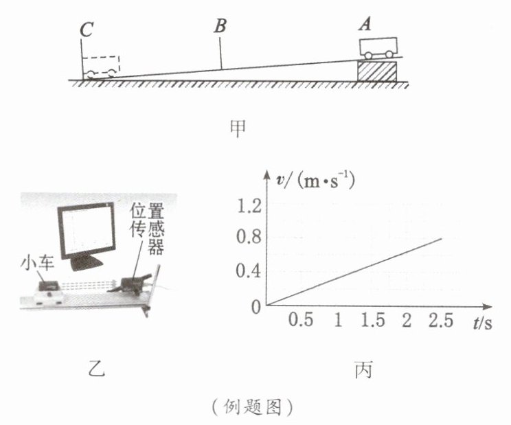 (3)物体运动的情况还可以通过另一种办法即时测定、显现出来。位置传感器利用超声波测出不同时刻小车与它的距离,计算机就可以算出小车在不同位置时的速度(如图乙所示)。屏幕图像如图丙所示,横轴为时间,纵轴为速度,通过图像可以看出小车在斜面上滑下时做