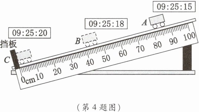 4. 如图所示是“测量小车运动的速度”的实验装置,实验时让小车从斜面的A点由静止滑下,分别测出小车到达B点和C点的时间,即可求出不同路段的平均速度。