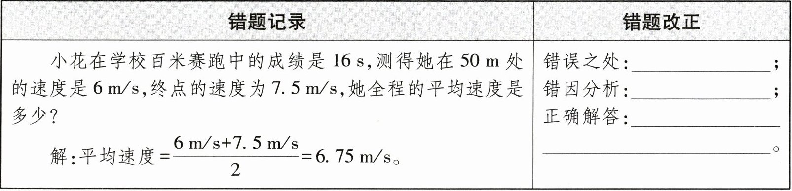 错误之处:平均速度计算错误;错因分析:平均速度等于总路程与总时间的比值,不是速度的平均值;正确解答:小花在学校百米赛跑全程的平均速度$v=\frac{s}{t}=\frac{100\ m}{16\ s}=6.25\ m/s$