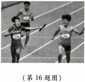 16. 杭州亚运会男子$ 4×100 $m接力决赛,中国队获得冠军。如图所示为中国队第三棒选手严海滨与第四棒选手陈佳鹏正在进行交接棒,在交接棒瞬间,陈佳鹏相对严海滨是