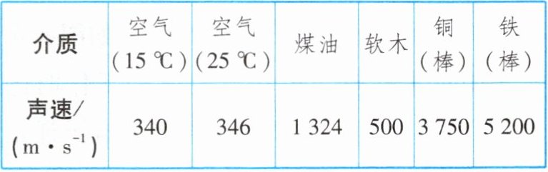 )|介质|空气(15℃)|空气(25℃)|煤油|软木|铜(棒)|铁(棒)|