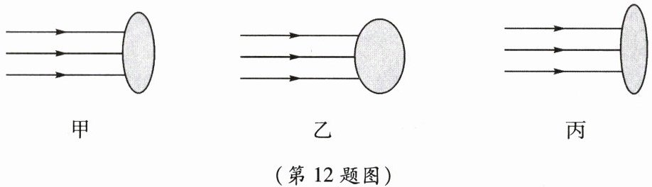 12. 小梦用薄膜充水后制成水凸透镜模拟眼球中的晶状体,来比较正常眼、近视眼和远视眼的焦距大小。实验中测得图甲中透镜的焦距为10cm,再将图甲分别挤压成图乙、图丙所示的形状,并分别测量其焦距,如图所示。