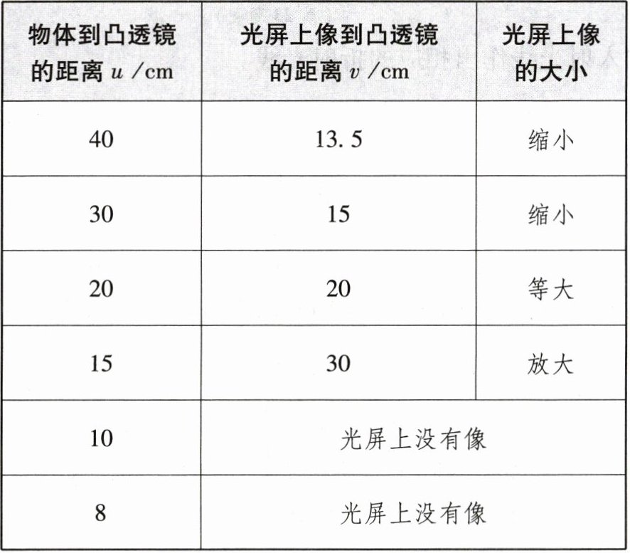 | 物体到凸透镜的距离 $ u / cm $ | 光屏上像到凸透镜的距离 $ v / cm $ | 光屏上像的大小 |
