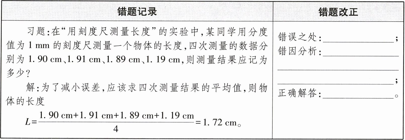 | 习题:在“用刻度尺测量长度”的实验中,某同学用分度值为 $ 1 \ mm $ 的刻度尺测量一个物体的长度,四次测量的数据分别为 $ 1.90 \ cm $、$ 1.91 \ cm $、$ 1.89 \ cm $、$ 1.19 \ cm $,则测量结果应记为多少?解:为了减小误差,应该求四次测量结果的平均值,则物体的长度 $ L = \frac{1.90 \ cm + 1.91 \ cm + 1.89 \ cm + 1.19 \ cm}{4} = 1.72 \ cm $。 | 错误之处: