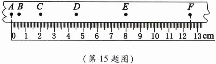 15. “频闪摄影”是指照相机每隔相同的时间拍照一次。如图所示是老师用“频闪摄影”探究小球的运动时记录下的小球从 A 点沿直线运动到 F 点的频闪照片(该频闪照相机每隔 $ 0.2 \ s $ 闪拍一次)。分析照片可知: