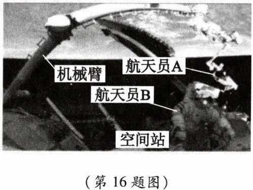 16. 2024 年 5 月 28 日,神舟十八号航天员圆满完成出舱任务。如图所示,搭乘机械臂的航天员 A 已为空间站安装好空间碎片防护装置,航天员 B 正在出舱。以空间站为参照物,安装好的防护装置是
