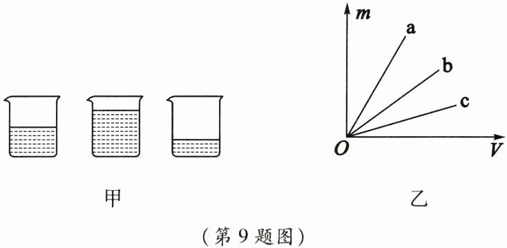 9. 如图甲所示,质量相同的a、b、c三种液体分别装在三个相同的烧杯中,如图乙所示是它们的质量与体积的关系图像,三个杯子从左至右依次装的液体种类是(