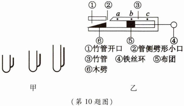 10. 如图甲所示是形状相似的三个钢笔笔套,它们的唯一不同就是长度不一样。小名依次吹这三个笔套时,发出声音的音调越来越低。小名在查阅资料后终于弄懂了吹笔套时,振动发声的物体是笔套内的空气柱。
