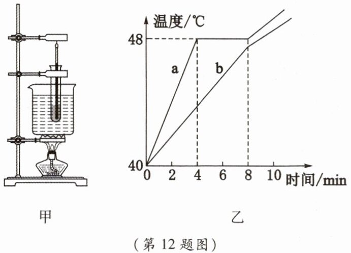 12. 小冰用如图甲所示装置探究固体的熔化特点,用温度计分别测量试管内a、b两种物质的温度,温度随时间变化的关系图像如图乙所示。实验中采用“水浴法”加热的目的是