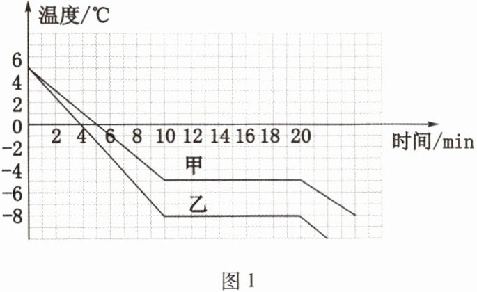他取完全相同的两杯水,分别掺入不同量的酒精,充分混合后,放入冰箱冷冻室。用温度计正确测量其温度值,每隔2min读取一次数据,记入表格。画出两种混合液温度随时间变化的图像,如图1所示。