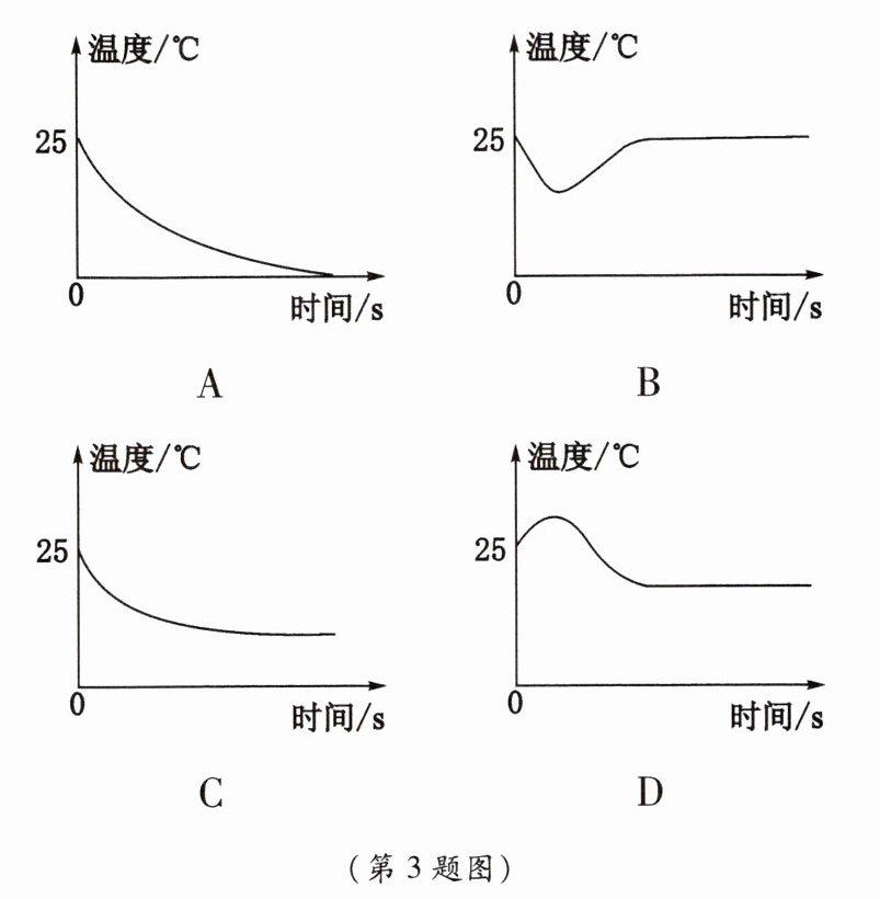 3. 室内温度为25℃,用浸有少量酒精的棉花裹在温度计的玻璃泡上,随着酒精的迅速蒸发,图中能正确反映温度计示数随时间变化的图像是(