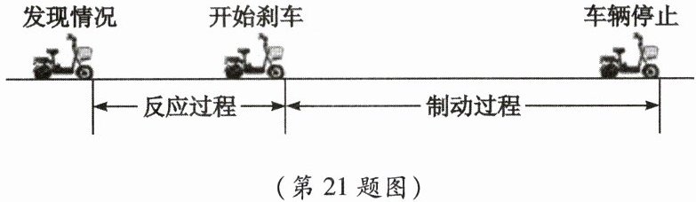 21. 有些人骑行电动自行车时喜欢看手机,存在很大的安全隐患。电动自行车遇到紧急情况时,紧急停车要经历反应和制动两个过程,电动自行车在反应过程做匀速直线运动,在制动过程做变速运动。如图所示,某人骑电动自行车以 $ 18 \ km/h $ 的速度匀速行驶,骑车时看一眼手机需要 $ 2 \ s $,在这段时间内相当于在无人驾驶状态下以原来的速度匀速行驶。该人发现情况紧急停车,在反应时间内电动自行车行驶了 $ 4 \ m $,制动过程所用时间为 $ 3 \ s $,电动自行车在这两个过程中行驶的总路程为 $ 9.5 \ m $。