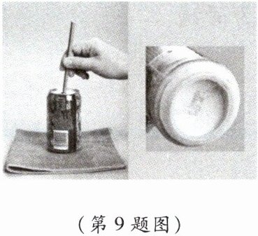 9. 如图所示,在标准大气压下,某同学将冰块放入空易拉罐中并加入适量的盐,用筷子搅拌大约半分钟,测得易拉罐中冰与盐水混合物的温度低于