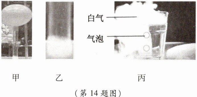 (2)取一块干冰放入常温下的水中(如图丙所示),杯中的水立即“沸腾”了,水中有大量气泡上升,并且在杯口出现大量“白气”。关于此现象,下列说法正确的是