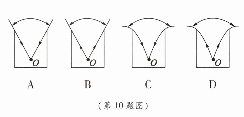 10. 如图所示,枯井中的青蛙位于井底O点“坐井观天”,假设空气分布均匀,下列选项中,能正确描述青蛙通过井口的观察范围的是(