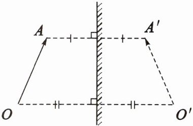 (1) 作A点关于镜面的对称点A'(作对称点留下的作图痕迹是对应点的虚线连线和垂直符号);