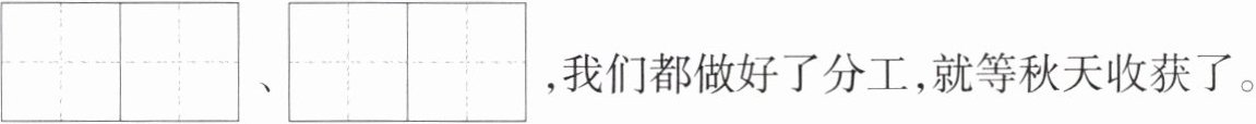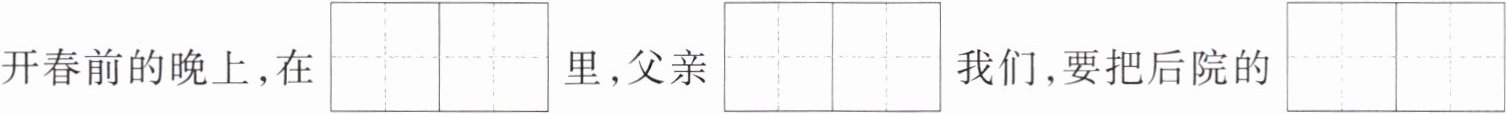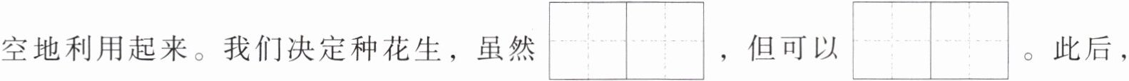 开春前的晚上,在$\begin{array}{|c|c|} \hline liáng & tíng \\ \hline & \\ \hline \end{array}\\ \hline & \\ \hline $里,父亲$\begin{array}{|c|c|} \hline fēn & fù \\ \hline & \\ \hline \end{array}\\ \hline & \\ \hline $我们,要把后院的$\begin{array}{|c|c|} \hline bàn & mǔ \\ \hline & \\ \hline \end{array}\\ \hline & \\ \hline $空地利用起来。我们决定种花生,虽然$\begin{array}{|c|c|} \hline ǎi & xiǎo \\ \hline & \\ \hline \end{array}\\ \hline & \\ \hline $,但可以$\begin{array}{|c|c|} \hline zhà & yóu \\ \hline & \\ \hline \end{array}\\ \hline & \\ \hline $。此后,$\begin{array}{|c|c|} \hline bō & zhǒng \\ \hline & \\ \hline \end{array}\\ \hline & \\ \hline $、$\begin{array}{|c|c|} \hline jiāo & shuǐ \\ \hline & \\ \hline \end{array}\\ \hline & \\ \hline $,我们都做好了分工,就等秋天收获了。