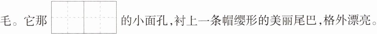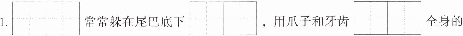 1. $\overset{\mathrm{sōng}\ \mathrm{shǔ}}{\begin{matrix}□□□□\\\end{matrix}{\begin{matrix}□□□□\\ }常常躲在尾巴底下\overset{\mathrm{xiē}\ \mathrm{liáng}}{\begin{matrix}□□□□\\\end{matrix}{\begin{matrix}□□□□\\ }$,用爪子和牙齿$\overset{\mathrm{shū}\ \mathrm{lǐ}}{\begin{matrix}□□□□\\\end{matrix}{\begin{matrix}□□□□\\ }$全身的毛。它那$\overset{\mathrm{líng}\ \mathrm{lóng}}{\begin{matrix}□□□□\\\end{matrix}{\begin{matrix}□□□□\\ }$的小面孔,衬上一条帽缨形的美丽尾巴,格外漂亮。