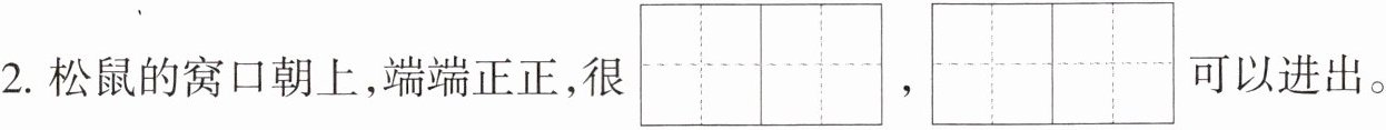 2. 松鼠的窝口朝上,端端正正,很$\overset{\mathrm{xiá}\ \mathrm{zhǎi}}{\begin{matrix}□□□□\\\end{matrix}{\begin{matrix}□□□□\\ }$,$\overset{\mathrm{miǎn}\ \mathrm{qiǎng}}{\begin{matrix}□□□□\\\end{matrix}{\begin{matrix}□□□□\\ }$可以进出。