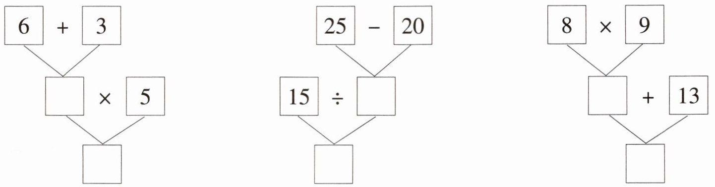 1.(1)(6+3)×5=45 15÷(25-20)=3 8×9+13=85 (2)4 12 4 (3)5×(7-4)=15 24÷(4+2)=4 (4)(①