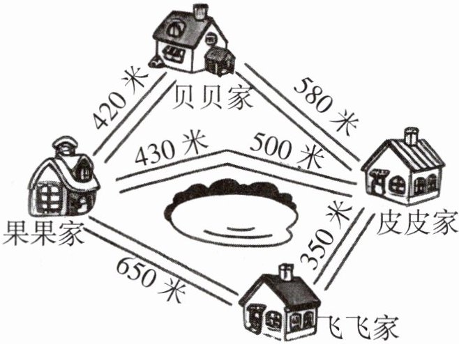 (2)皮皮从家出发到果果家,一共有几条路可以走?最少要走多少米?